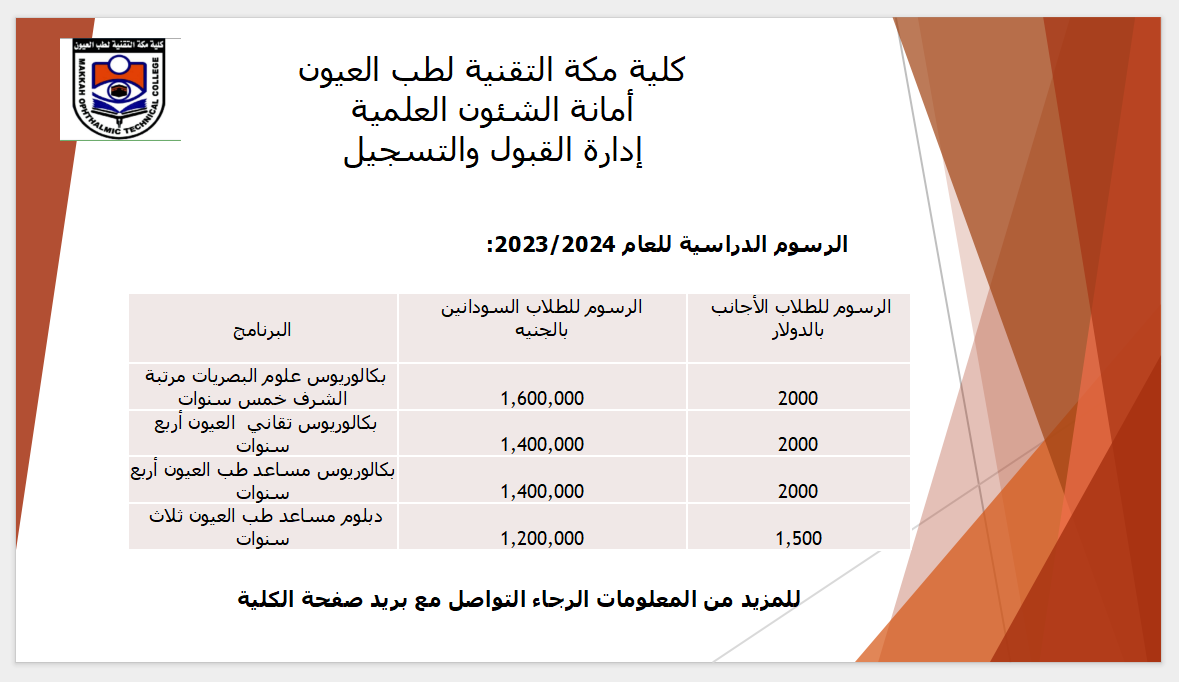 اعلان مهمتهنئ أمانة الشئون العلمية بالكلية الطلاب المرشحين بالقبول بالكلية لكل البرامج وتعلن عن:بدء اجراءات التسجيل والكشف الطبي عبر الرابط أدناه 1/https://makkacollege.edu.sd/Registrationفي الفترة من 18/9/2025وحتي 2/10/2025 وفي حالة عدم تكملة إجراءات التسجيل في الفترة المحددة يفقد الطالب فرصته